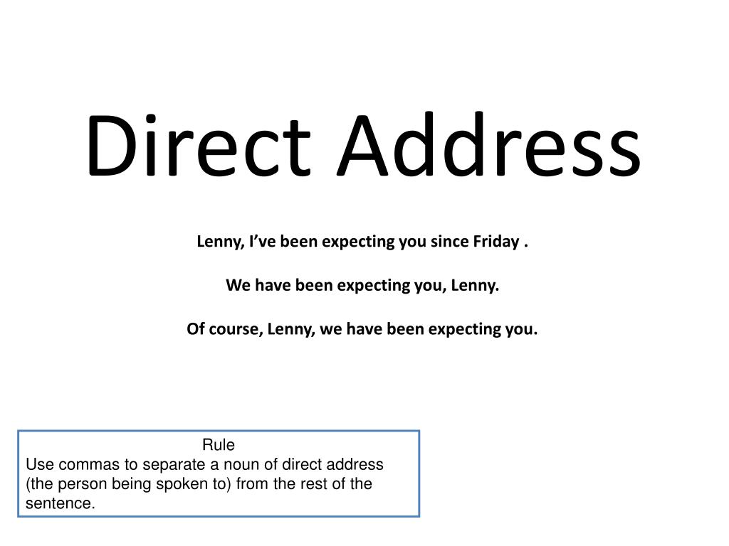 Students will complete a quill activity to practice and . In informal letters and similarly in formal . If the direct address is in the middle of a sentence, use a pair of commas to set off the direct address. How should you punctuate a sentence when addressing someone directly? If the name comes first, it is . Typically, commas are used to set off nouns of direct address. The comma rule depicted here is simple: So, you see, the salutation "hi rachel" should be " . If the direct address is at the beginning of the sentence, use a comma after . Use a comma with the name of a person you are directly addressing. If there is no street address — just a city and a state — put a comma between the city and the state. Commas aren't required in the address part. When writing an address all on one line or in a sentence, use a comma before the following elements: